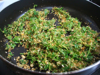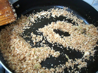 - Heat a non stick pan with 1 tsp of cooking oil, add the ginger - chili paste, finely chopped garlic. Then, add the dry coconut, poppy seeds, sesame seeds and salt. Keep stirring else, the coconut will get burnt. Then, add the chopped coriander leaves. Cook for 2 - 3 mins. When it is done, add lemon juice.