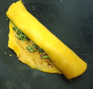 - Spread a spoonful of the paste over the disc. Then, take 1 tsp of the coriander stuffing, spread it evenly on the top. Starting from one side tightly roll over the stuffing.