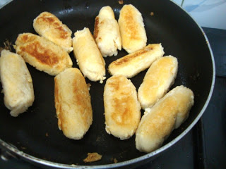 Dip the fingers in flour batter, roll over the bread crumbs. Pan fry in a non stick pan. Make sure it gets cooked to golden colour on all sides.