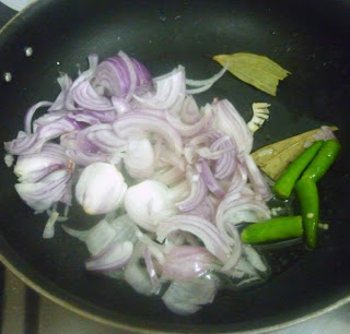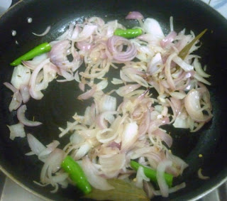 In a non stick pan, heat oil add bay leaf and cumin seeds. When the cumin seeds start crackling add the onion julinnes along with chopped green chilies. Saute till the onions turn brown.