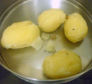 Wash and mark on the potatoes using a knife. Microwave for 8 mins. Once done, soak in water and peel the skin off.