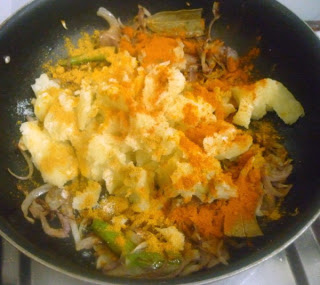 Now add crumbled potatoes, saute well till it is coated with onions. Add all the masalas and combine well.