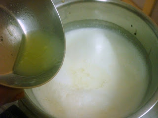In a pan, boil milk. When it boils over, simmer for few mins, then add lemon juice. Cook on high, you will see the whey water separating from milk and leave protein away.