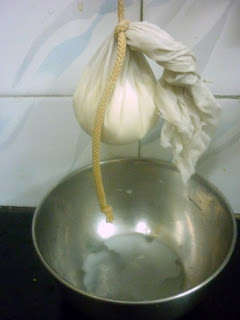 Using a muslin cloth, drain cheese/paneer, remove the water. Hang this in a cloth and let it drain.