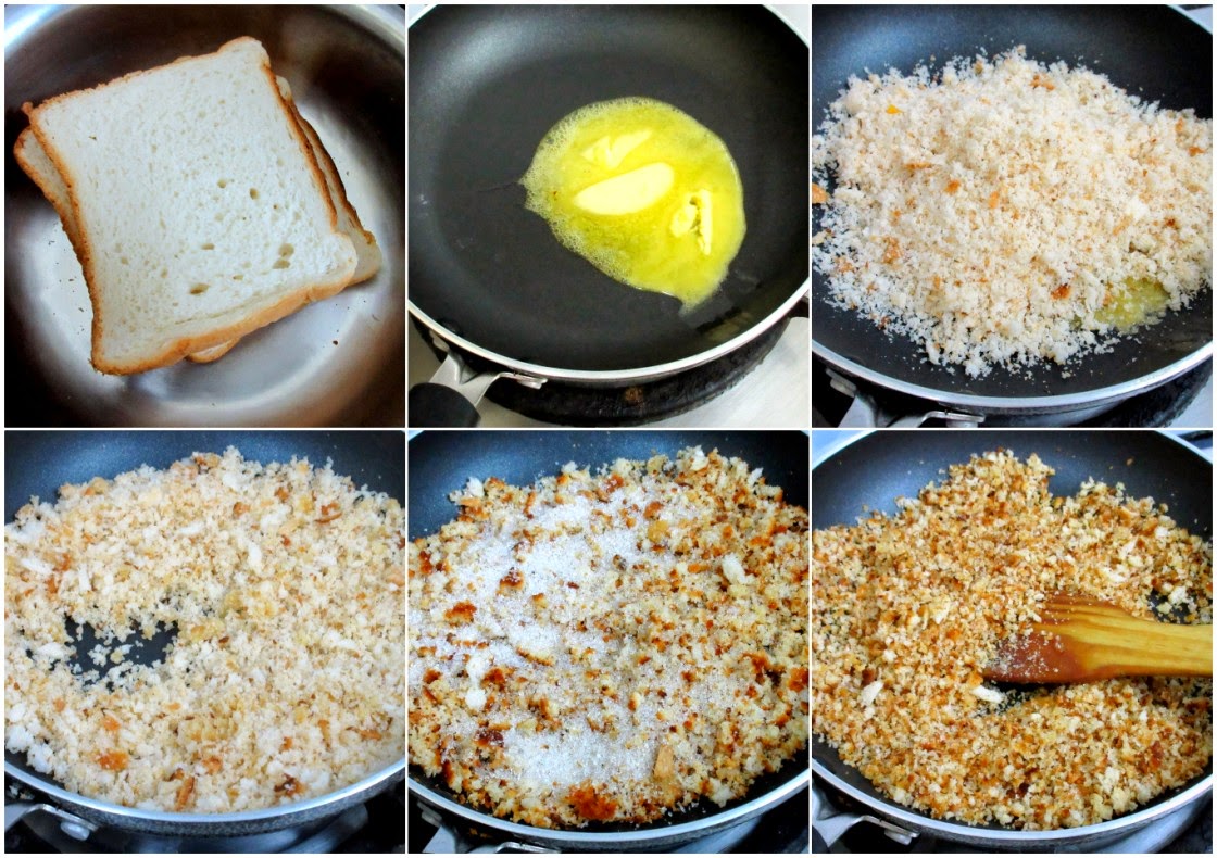 Simmer and stir occasionally, the breadcrumbs becomes very crispy and tasty. Finally sprinkle in the sugar. The granules didn't melt that fast. And also make sure it doesn't lump up.