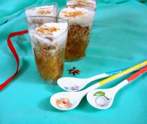 I thought it was a good decision to plate it as small individual portions. It is quite rich and filling. I am not sure if boys would've liked it, however rest of the folks loved it. The original recipes calls for the apple to be pureed. However I simply chopped it fine, assuming it will melt and become paste. The pieces held their shape, yet were so soft to melt in the mouth.