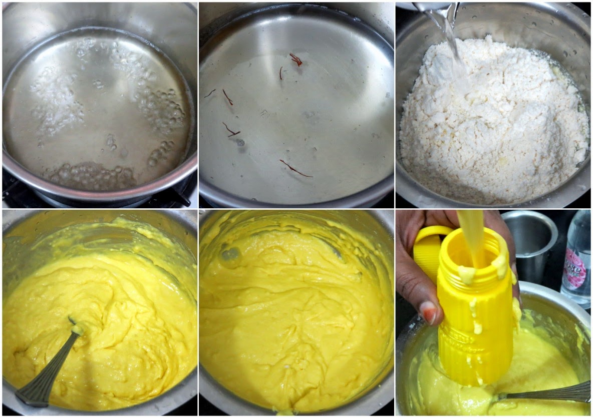 Mix the powder with enough water to get a dropping batter. Transfer to the press. Heat a Kadai with oil.