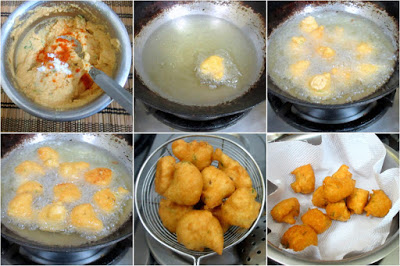 - Then drop in small balls of batter into the oil. Slowly move the balls with the ladle for the oil to cover it, and this will make the balls to be cooked all over. Drain it on a kitchen towel and set it aside.