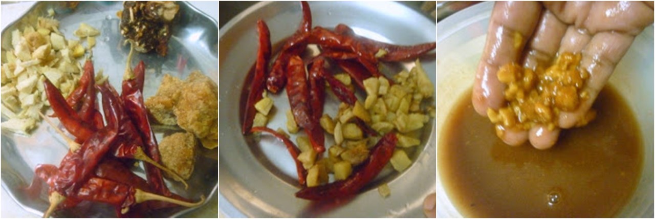 Then in a mixer, take ginger, red chilies, tamarind jaggary mix along with salt and blend to a smooth paste. No need to add water.