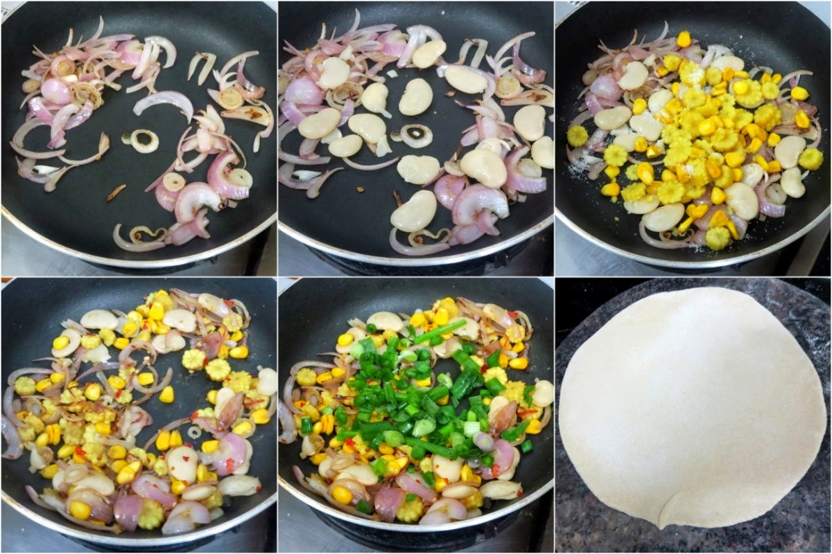 Heat a non stick pan with olive oil, saute chopped onions from spring onions, onion, beans and baby corn. Saute for 5 - 7 mins till done.