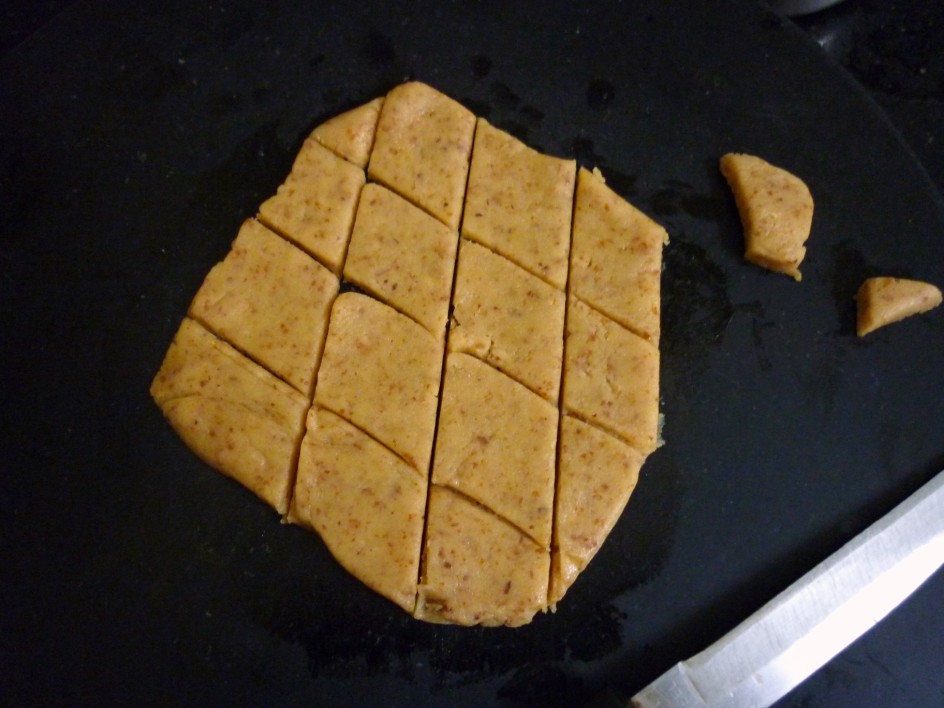 When warm, knead into a smooth dough and spread on a greased surface. Pat it using a rolling pin and mark the pieces using a knife.