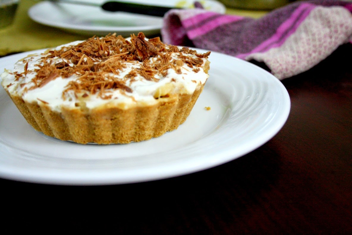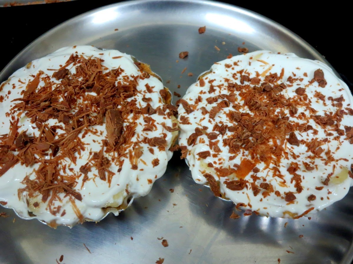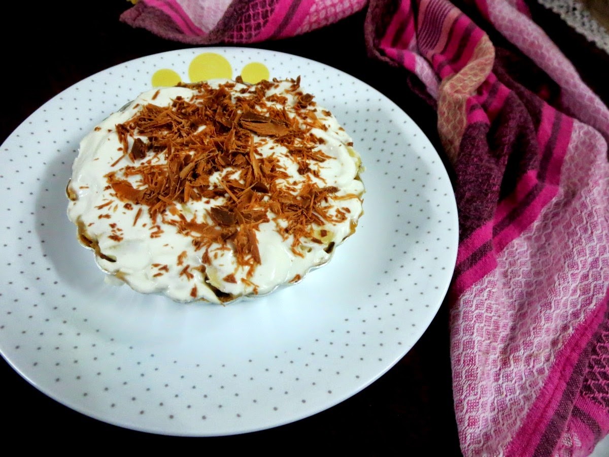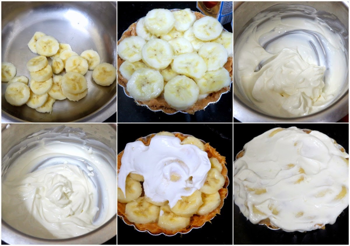 Anyway, our night adventure came quickly to an end, with me whipping out the cream and teaching Konda how one twists the badminton twists, which is helpful in whipping the cream. She was happy that she finally got to help with something and took a promise that she will be the person to taste this dessert. So I am sorry that I can't yet share the sliced picture of this Banoffee Pie, will surely update the post again with the sliced pie!