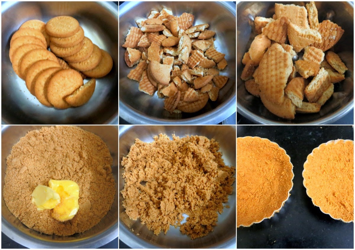 Break and take the digestive biscuits in a mixer and pulse well till you get soft powder. Add soft butter and mix well.