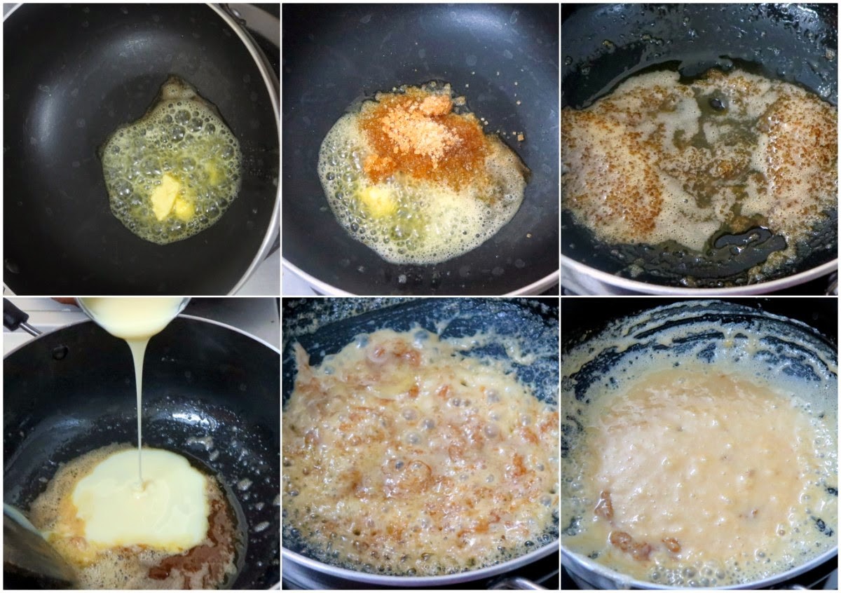 For the Toffee layer, heat a non stick pan with butter, add brown sugar and mix well. When the sugar melts, add the condensed milk in stages and blend well, till it becomes a thick toffee consistency.