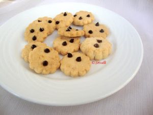 Preheat the oven to 185 degrees C. Meanwhile place the shaped cookies on the tray. Place the chocolate chips on the top, press them slightly inside else they will fall off after being baked.