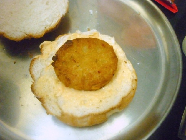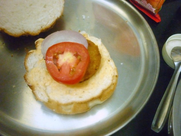 This burger uses store bought burger buns, Eggless Mayonnaise sauce, Veg Patties aka Aloo Tikkies. All I did was simply assemble everything with extra cheese, onion, tomatoes etc for garnish.