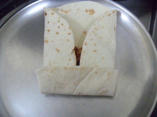 Warm the tortillas and spread the filling over one side. Follow the folding as shown in the pictures.