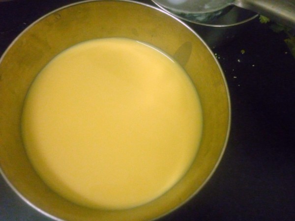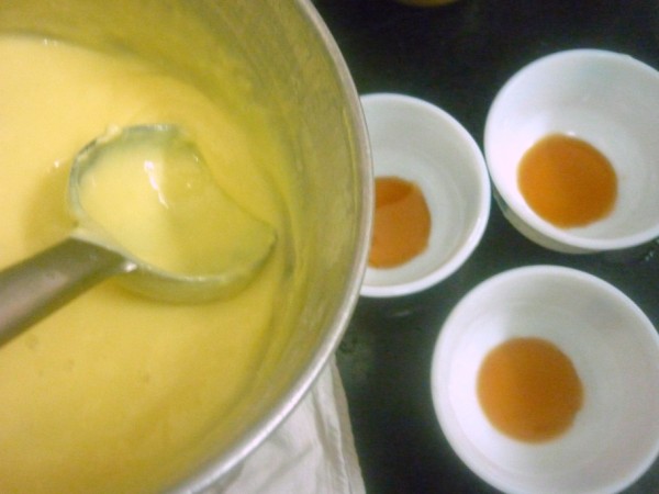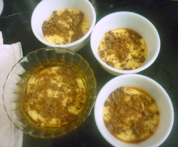 Now add vanilla essence and remove from fire. In individual serving bowls, add the caramelized sugar first.