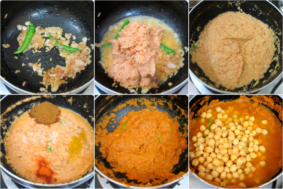 Remove and cool it down. Then take the roasted ingredients along with 1 ladleful of boiled channa and grind to a smooth paste with adding water.