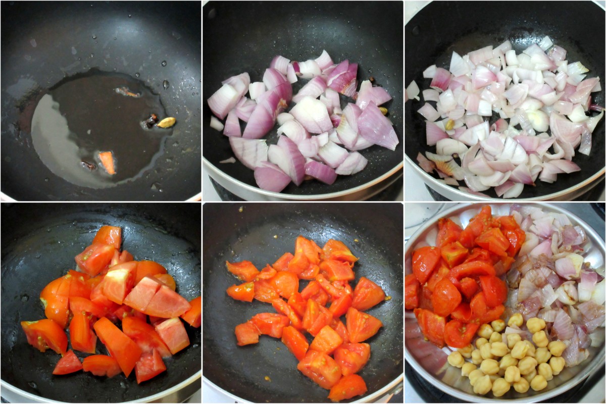 Heat oil in a nonstick pan, saute the spices, then add onions, saute well. Then add tomatoes, saute.