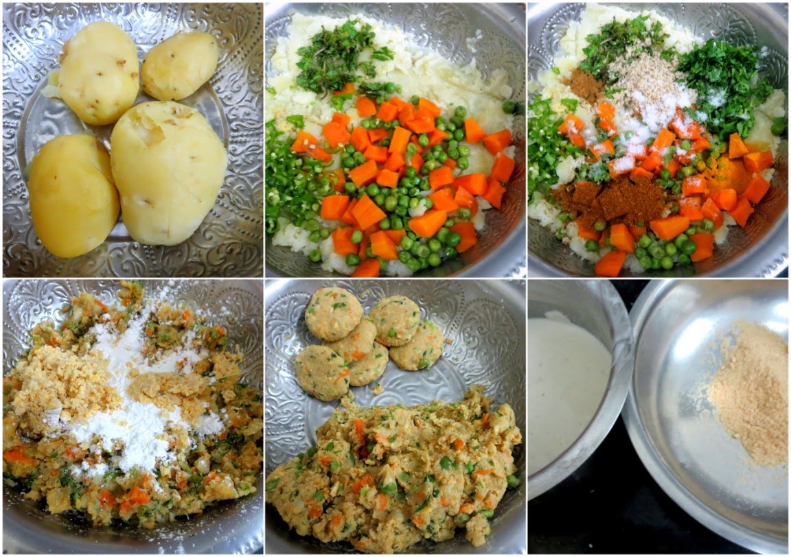 In a wide bowl, take the potatoes, boiled vegetables, add finely chopped coriander leaves, mint leaves, salt, spice powders, chickpea paste, corn flour,