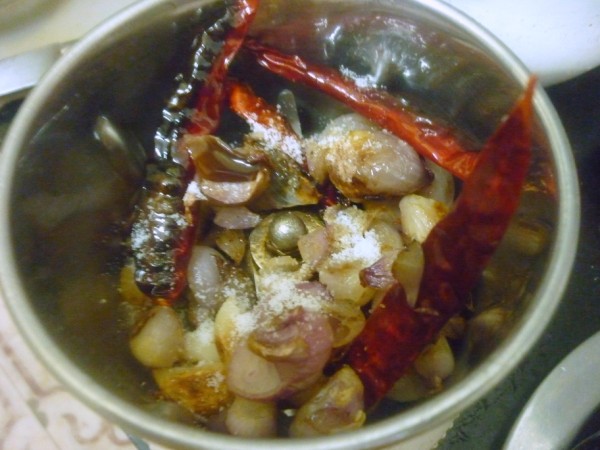 Heat a non stick pan with oil, saute the onions, garlic and red chilies together till the onions turn colour. Allow to cool.