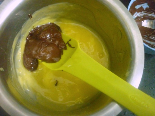 Melt the butter in microwave for a minute. Chop the chocolate slabs into smaller pieces and melt for 30 secs.