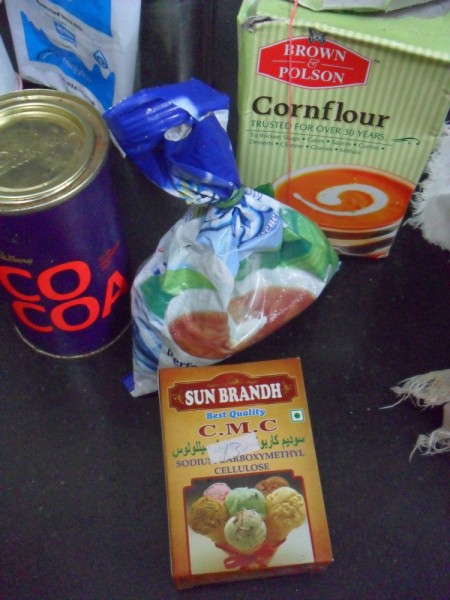 In a bowl, take the milk powder, add cornflour, CMC. Boil milk in a pan, add sugar, and let it melt.