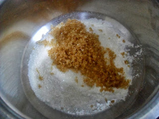 In a bowl, stir together flour, granulated sugar, brown sugar, cocoa, baking soda and salt. Add water, oil, vinegar and vanilla essence. Beat with whisk or spoon until smooth. Pour batter into prepared pan.