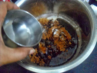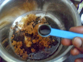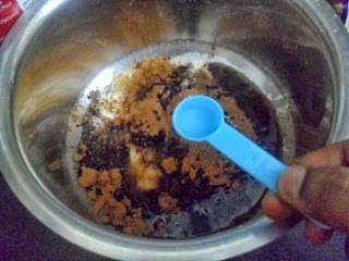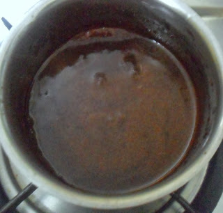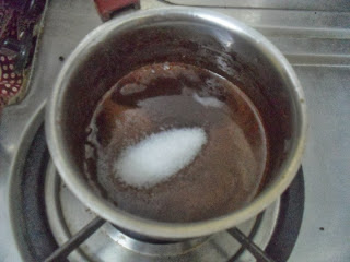 On stove top, take the butter in a thick bottom pan, melt over low flame, add the sugar and cocoa powder. Stir in milk and continue cooking till the mixture comes together