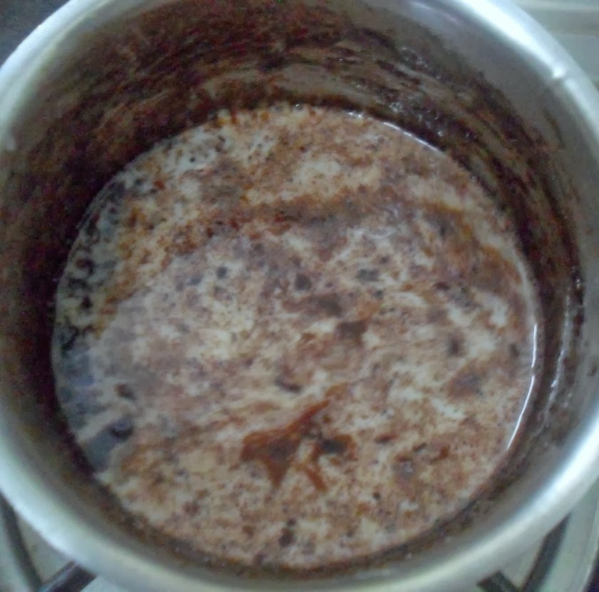 On stove top, take the butter in a thick bottom pan, melt over low flame, add the sugar and cocoa powder. Stir in milk and continue cooking till the mixture comes together
