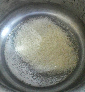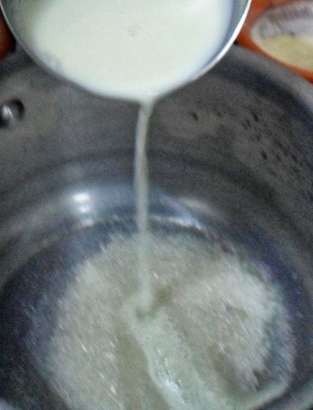 In a non stick pan or thick bottom pan, take the milk, sugar and heat it till the sugar melts.