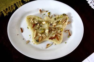 Pour this in a greased tray and spread evenly. Finally sprinkle the finely chopped almonds and pistas.