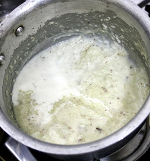 Then add the coconut and mix evenly. Finally add the fresh cream. Cook this for few mins until everything is mixed well. Continue cooking till it leaves the sides.