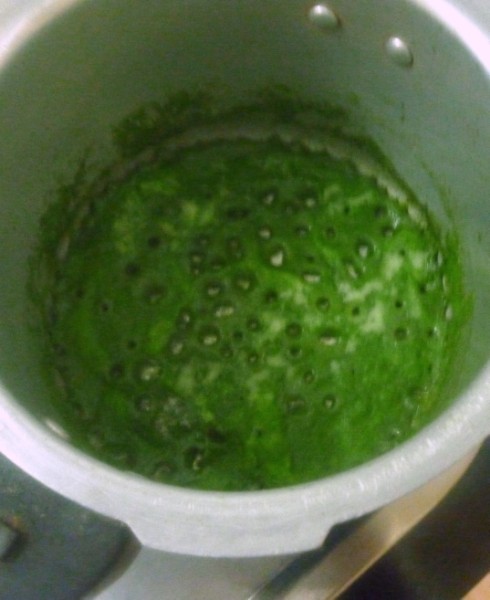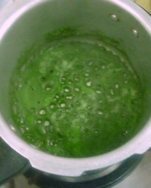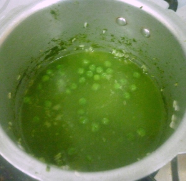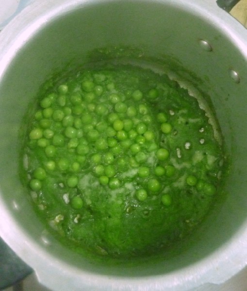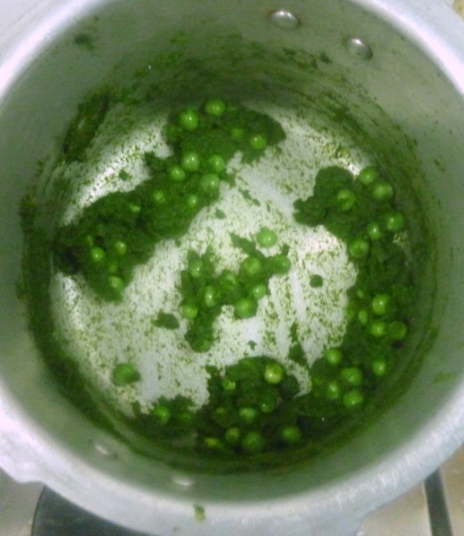 In a pressure cooker, add the ghee and oil mix, add the ground masala and cook till the water evaporates and the paste is cooked well. Then add the fresh peas and simmer.