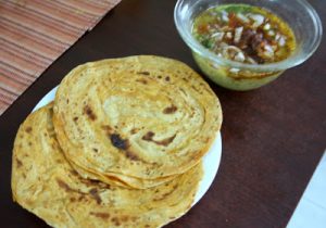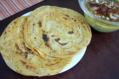 The satpura is a layered paratha. Sat means 'seven' and pur means 'layers'. It is made from regular chapatti dough.