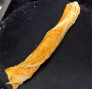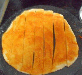 Smear with ghee, sprinkle salt, red chili powder and flour. Spread it on the disc. Cut strips.