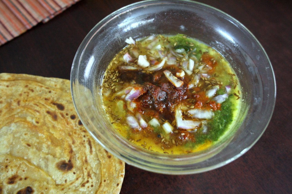 For the second day of Combo Dishes, I selected to make Daal Moong with Satpura, a typical combination of the Sindhi Cuisine. As expected this was suggested by Vaishali and I went on to search for the recipe. Somehow this didn't turn out in the search and I had to ask her for the link. checking this, I was really intrigued as the dal is a sort of assembled dish.Vaishali says Daal moong is a typical Sindhi breakfast, however in recent times with many preferring lighter breakfast, this combination has shifted to lunch. I do agree with this, having made this for the lunch today. The dal was superb and the rotis were spicy and heavy. The dal is a combination of two dals cooked separately, garnished with spices, raw onions, and chutneys. The final mix of all the assembled ingredients makes it a feast!