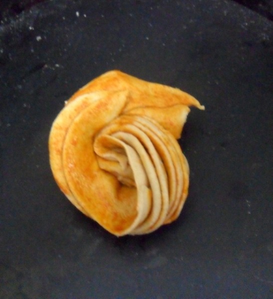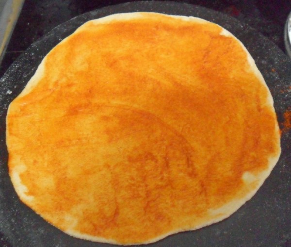 Smear with ghee, sprinkle salt, red chili powder and flour. Spread it on the disc. Cut strips.
