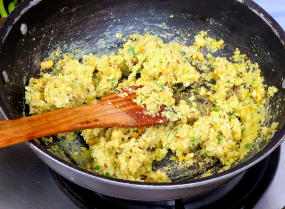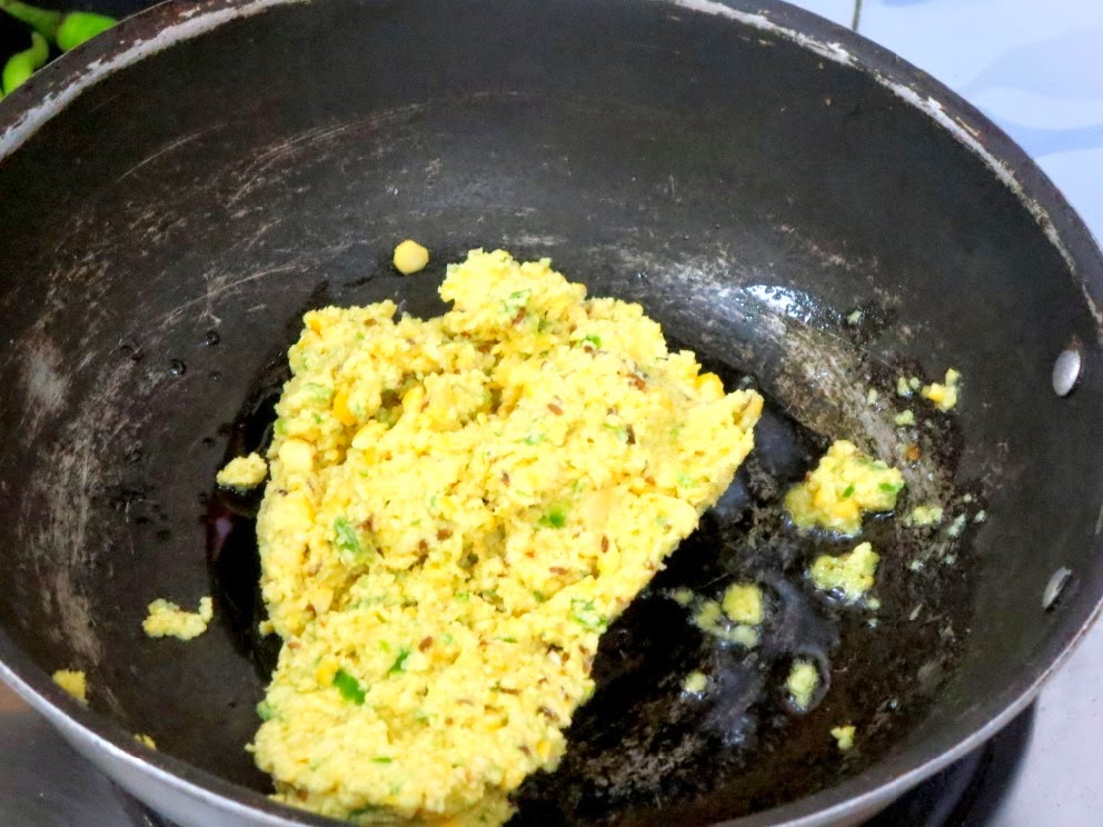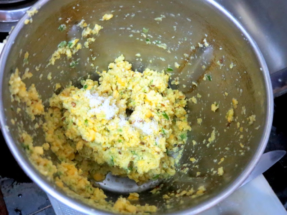 Heat a pan with a tsp oil, saute the ground dal mix and cook it for couple minutes, making sure the stuffing is not burnt but cooked well. The paste should still be moist.