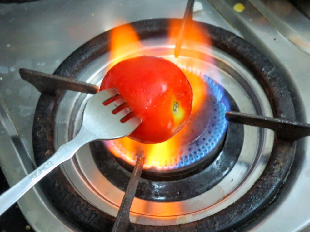 roasting the tomatoes on gas - that looks so difficult. did you not get the juices out while doing this?