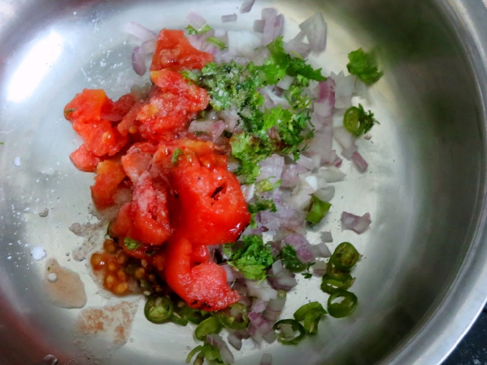 Finely chop the tomatoes, along with green chilies, onions, coriander leaves.
