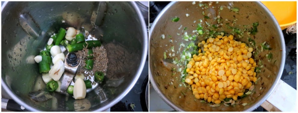 Add chopped green chilies, garlic, salt, and cumin seeds. Grind it to a paste, making sure the dal is not complete a paste, you can let it be a bit coarse.