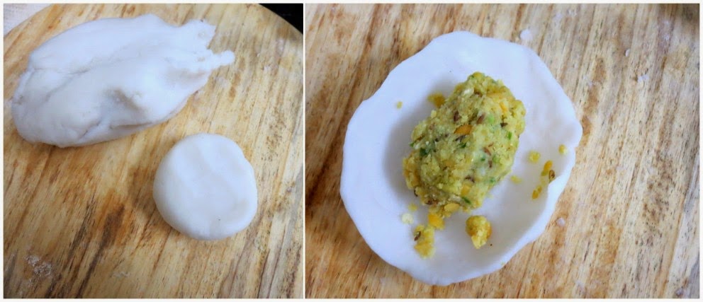 Fold it to make gujiya/kajjikaya like shape. Work the seam with oiled hands so as to get smooth edges. Or you can make it as Kozhukattai