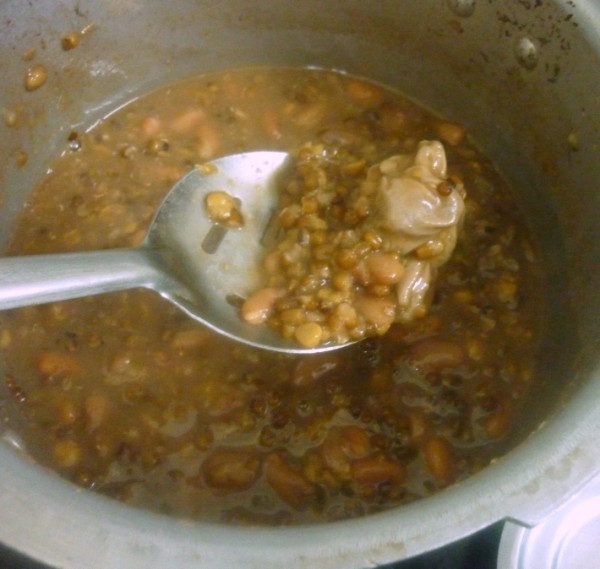 When the pressure subsides in the cooker, remove the spice bag. Add the cooked dal to the simmering pan, add more water as required. Continue cooking for the next 15 mins. The consistency should be like thick soup.