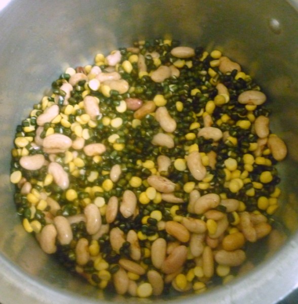Wash and rinse the lentils. Cover with thrice it's amount of water and saok overnight. Change waters and take the lentils in pressure cooker.