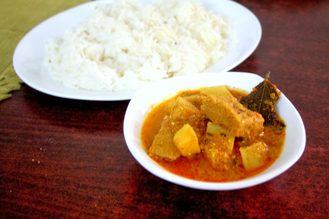 This is a traditional dish that's purely satvik, meaning without onion or garlic. An interesting note to read was the fact that this dish was created by the Bengali widows who were not allowed to eat onion or garlic. And they came up with something that will still be very tasty and delightful. After eating I had to agree with Sandy that one wouldn't miss the onion or garlic. I wouldn't have figured out if I hadn't cooked it myself.