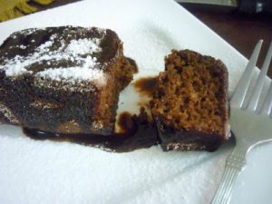 Pour the syrup over the warm brownie and dust with sugar.