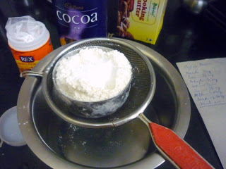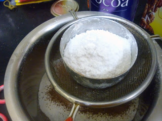 Sieve maida, cocoa, soda & baking powder in a bowl.