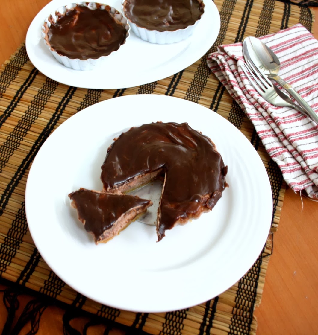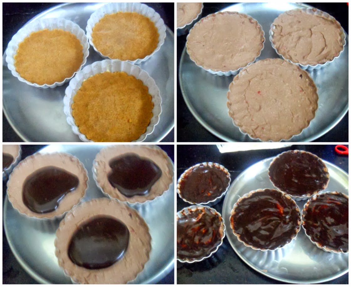 Once the biscuit crust is set, layer on top with cheese. Set it again for a couple of hours, before finally layering with chocolate glaze.